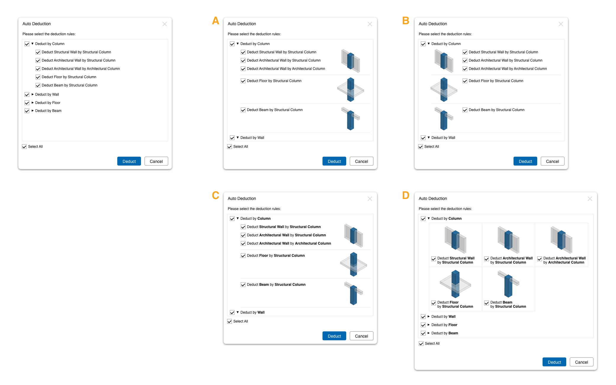 Here is an example of different illustration layout options of a feature related to quantity takeoff: